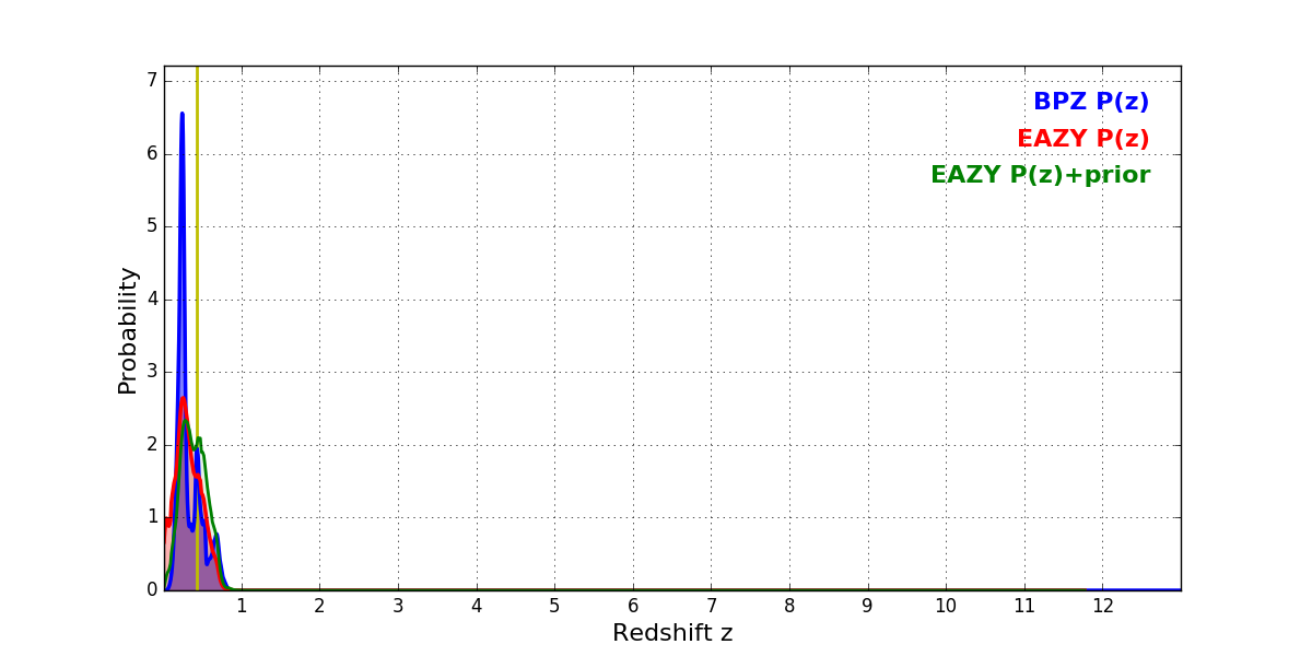 In P(z) plots: Yellow lines mark the cluster redshift z = 0.425,
