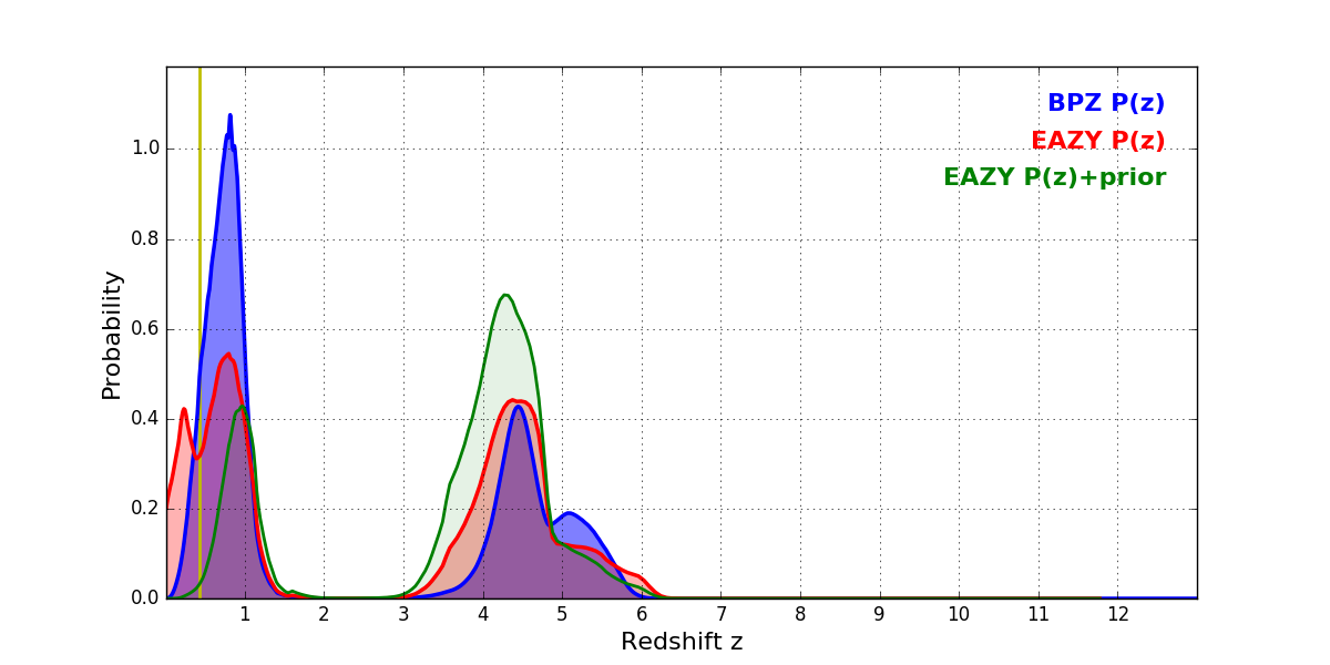 In P(z) plots: Yellow lines mark the cluster redshift z = 0.425,