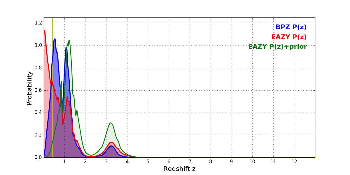 In P(z) plots: Yellow lines mark the cluster redshift z = 0.425,