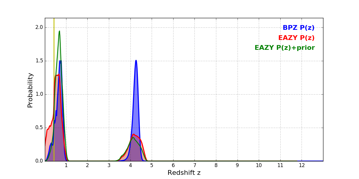 In P(z) plots: Yellow lines mark the cluster redshift z = 0.425,