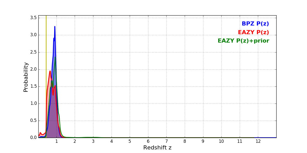 In P(z) plots: Yellow lines mark the cluster redshift z = 0.425,