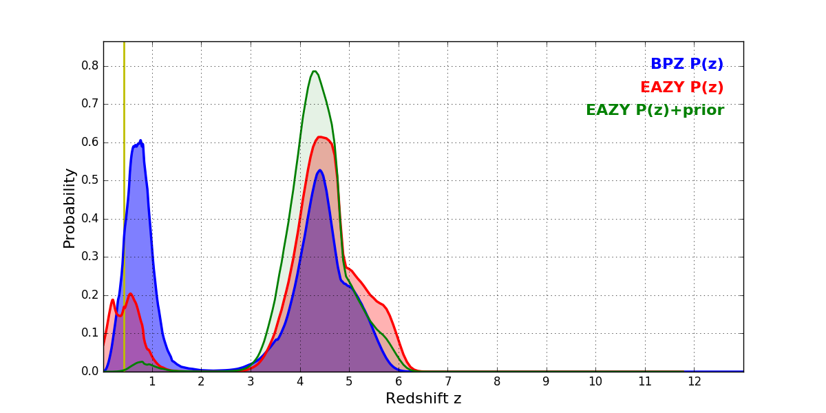 In P(z) plots: Yellow lines mark the cluster redshift z = 0.425,