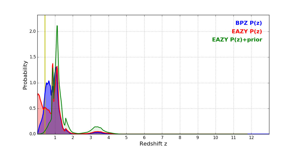 In P(z) plots: Yellow lines mark the cluster redshift z = 0.425,