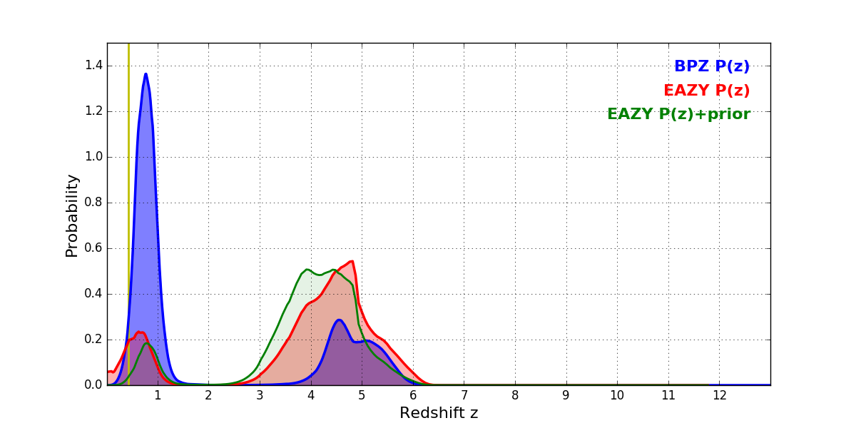 In P(z) plots: Yellow lines mark the cluster redshift z = 0.425,