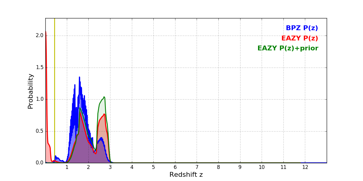 In P(z) plots: Yellow lines mark the cluster redshift z = 0.425,