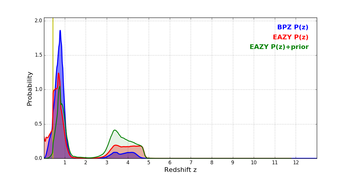 In P(z) plots: Yellow lines mark the cluster redshift z = 0.425,