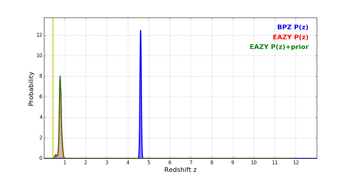 In P(z) plots: Yellow lines mark the cluster redshift z = 0.425,