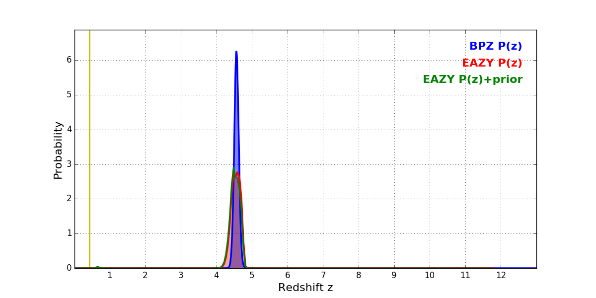 In P(z) plots: Yellow lines mark the cluster redshift z = 0.425,