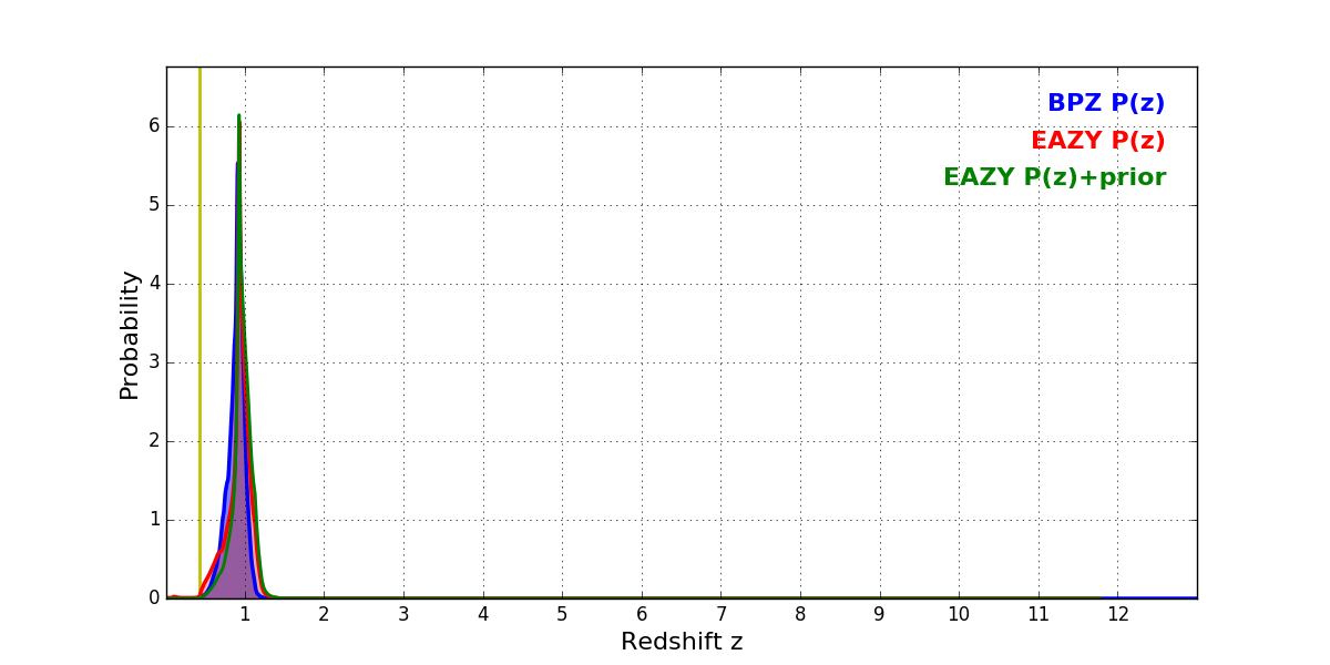 In P(z) plots: Yellow lines mark the cluster redshift z = 0.425,