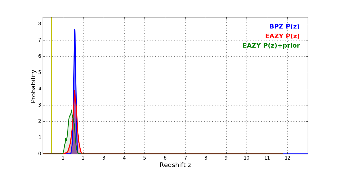 In P(z) plots: Yellow lines mark the cluster redshift z = 0.425,