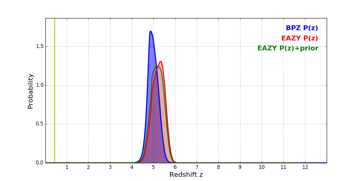 In P(z) plots: Yellow lines mark the cluster redshift z = 0.425,