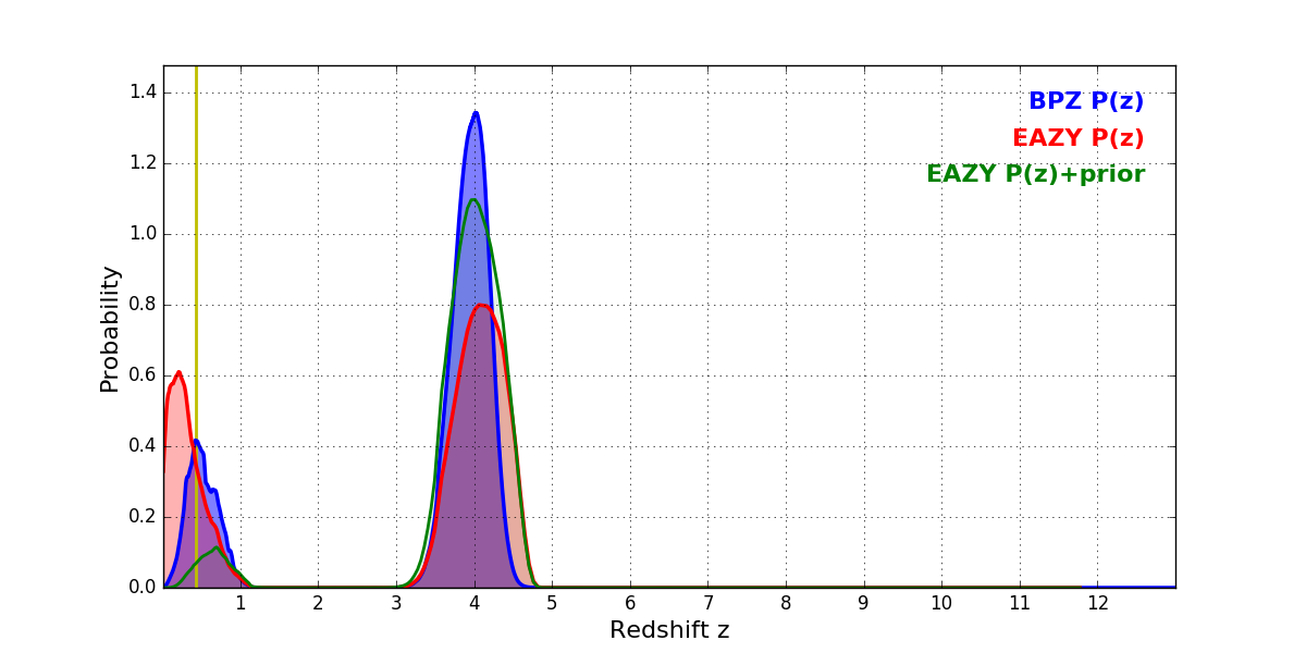 In P(z) plots: Yellow lines mark the cluster redshift z = 0.425,