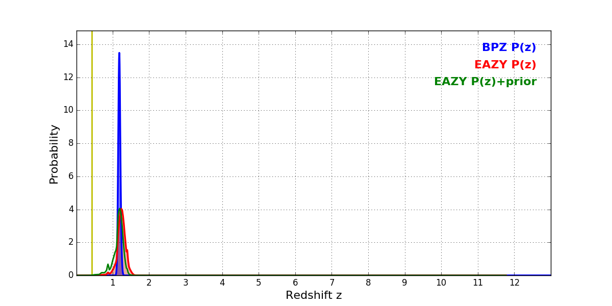 In P(z) plots: Yellow lines mark the cluster redshift z = 0.425,