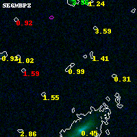 Object #10201 x,y = (2841, 7670) RA, Dec = (04:54:14.112, 02:59:32.28) = (73.55880, 2.99230) BPZ = 0.989 [0.231--2.988] type = 8.90 (SB2_B10 - SB1_B10) chisq2 = 0.12 ODDS = 0.12 z_cluster = 0.203