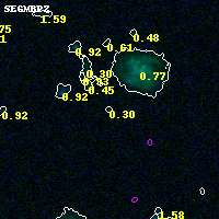 Object #11357 x,y = (3081, 6932) RA, Dec = (04:54:13.152, 02:58:48.00) = (73.55480, 2.98000) BPZ = 0.305 [0.138--3.899] type = 8.20 (SB1_B10 - SB2_B10) chisq2 = 0.35 ODDS = 0.06 z_cluster = 0.203