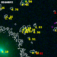 Object #12075 x,y = (1680, 6650) RA, Dec = (04:54:18.768, 02:58:31.08) = (73.57820, 2.97530) BPZ = 0.781 [0.616--2.264] type = 8.30 (SB1_B10 - SB2_B10) chisq2 = 0.01 ODDS = 0.17 z_cluster = 0.203