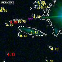 Object #12110 x,y = (1139, 6652) RA, Dec = (04:54:20.928, 02:58:31.08) = (73.58720, 2.97530) BPZ = 0.314 [0.198--0.415] type = 8.00 (SB1_B10) chisq2 = 0.00 ODDS = 0.62 z_cluster = 0.203