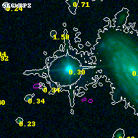Object #1312   x,y = (7294, 931)   RA, Dec = (04:53:56.280, 02:52:48.00) = (73.48450, 2.88000)   BPZ = 0.299 [0.218--0.370]   type = 8.80 (SB2_B10 - SB1_B10)   chisq2 = 0.03   ODDS = 0.85   z_cluster = 0.203