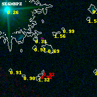 Object #13832 x,y = (2426, 5743) RA, Dec = (04:54:15.768, 02:57:36.72) = (73.56570, 2.96020) BPZ = 0.692 [0.519--2.208] type = 9.00 (SB2_B10) chisq2 = 0.01 ODDS = 0.15 z_cluster = 0.203