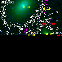 Object #1611 x,y = (2077, 1243) RA, Dec = (04:54:17.184, 02:53:06.72) = (73.57160, 2.88520) BPZ = 0.919 [0.192--3.465] type = 9.40 (SB2_B10 - SB3_B10) chisq2 = 0.44 ODDS = 0.09 z_cluster = 0.203