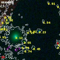 Object #16464 x,y = (3181, 4839) RA, Dec = (04:54:12.768, 02:56:42.36) = (73.55320, 2.94510) BPZ = 0.916 [0.299--3.021] type = 9.00 (SB2_B10) chisq2 = 0.76 ODDS = 0.13 z_cluster = 0.203