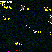 Object #16751 x,y = (2533, 4708) RA, Dec = (04:54:15.360, 02:56:34.44) = (73.56400, 2.94290) BPZ = 0.382 [0.106--3.262] type = 9.90 (SB3_B10 - SB2_B10) chisq2 = 0.27 ODDS = 0.12 z_cluster = 0.203