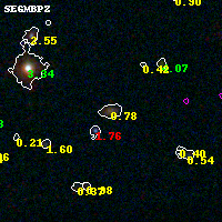 Object #16921 x,y = (1236, 4636) RA, Dec = (04:54:20.544, 02:56:30.12) = (73.58560, 2.94170) BPZ = 0.776 [0.712--0.888] type = 8.60 (SB2_B10 - SB1_B10) chisq2 = 0.44 ODDS = 0.86 z_cluster = 0.203