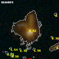 Object #1694 x,y = (4826, 967) RA, Dec = (04:54:06.168, 02:52:50.16) = (73.52570, 2.88060) BPZ = 0.519 [0.446--0.587] type = 5.90 (Sbc_B10 - ES0_B10) chisq2 = 0.00 ODDS = 0.92 z_cluster = 0.203