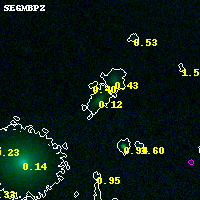 Object #17202 x,y = (3039, 4496) RA, Dec = (04:54:13.320, 02:56:21.84) = (73.55550, 2.93940) BPZ = 0.125 [0.066--3.352] type = 4.20 (Ell4_A_0 - ES0_B10) chisq2 = 0.00 ODDS = 0.71 z_cluster = 0.203