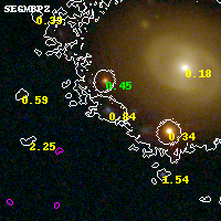 Object #17285 x,y = (1558, 4382) RA, Dec = (04:54:19.248, 02:56:15.00) = (73.58020, 2.93750) BPZ = 0.839 [0.039--1.041] type = 9.30 (SB2_B10 - SB3_B10) chisq2 = 0.56 ODDS = 0.52 z_cluster = 0.203