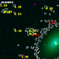 Object #1948 x,y = (1963, 1370) RA, Dec = (04:54:17.640, 02:53:14.28) = (73.57350, 2.88730) BPZ = 0.453 [0.077--2.636] type = 8.90 (SB2_B10 - SB1_B10) chisq2 = 0.01 ODDS = 0.24 z_cluster = 0.203