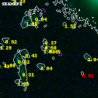 Object #2168 x,y = (2842, 1457) RA, Dec = (04:54:14.112, 02:53:19.68) = (73.55880, 2.88880) BPZ = 0.450 [0.131--3.054] type = 9.30 (SB2_B10 - SB3_B10) chisq2 = 0.06 ODDS = 0.08 z_cluster = 0.203