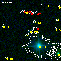 Object #2452 x,y = (2420, 1579) RA, Dec = (04:54:15.816, 02:53:26.88) = (73.56590, 2.89080) BPZ = 0.227 [0.126--2.207] type = 10.70 (SB11_A_0_l - SB3_B10) chisq2 = 0.48 ODDS = 0.07 z_cluster = 0.203