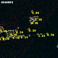 Object #2619 x,y = (6536, 1647) RA, Dec = (04:53:59.328, 02:53:30.84) = (73.49720, 2.89190) BPZ = 0.387 [0.139--3.262] type = 11.00 (SB11_A_0_l) chisq2 = 0.07 ODDS = 0.08 z_cluster = 0.203