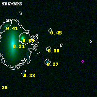 Object #2840 x,y = (1303, 1739) RA, Dec = (04:54:20.280, 02:53:36.24) = (73.58450, 2.89340) BPZ = 0.302 [0.093--3.897] type = 7.50 (SB1_B10 - Scd_B10) chisq2 = 0.17 ODDS = 0.08 z_cluster = 0.203