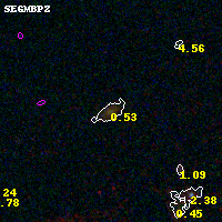 Object #2905 x,y = (6485, 1760) RA, Dec = (04:53:59.520, 02:53:37.68) = (73.49800, 2.89380) BPZ = 0.529 [0.425--0.731] type = 8.50 (SB2_B10 - SB1_B10) chisq2 = 0.36 ODDS = 0.47 z_cluster = 0.203