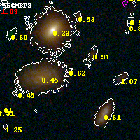 Object #3207 x,y = (3885, 1873) RA, Dec = (04:54:09.936, 02:53:44.52) = (73.54140, 2.89570) BPZ = 0.619 [0.116--4.278] type = 8.50 (SB2_B10 - SB1_B10) chisq2 = 0.41 ODDS = 0.13 z_cluster = 0.203