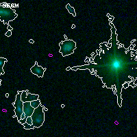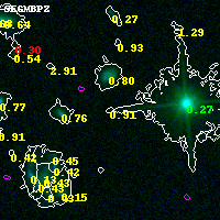 Object #3297 x,y = (1521, 1906) RA, Dec = (04:54:19.416, 02:53:46.32) = (73.58090, 2.89620) BPZ = 0.912 [0.399--5.949] type = 3.00 (Ell5_A_0) chisq2 = 0.66 ODDS = 0.10 z_cluster = 0.203