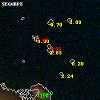 Object #3423 x,y = (6124, 1956) RA, Dec = (04:54:00.960, 02:53:49.56) = (73.50400, 2.89710) BPZ = 2.834 [1.932--3.046] type = 10.80 (SB11_A_0_l - SB3_B10) chisq2 = 0.40 ODDS = 0.80 z_cluster = 0.203