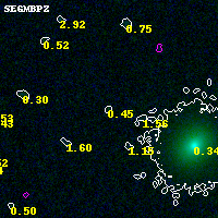 Object #4726 x,y = (6915, 2459) RA, Dec = (04:53:57.792, 02:54:19.80) = (73.49080, 2.90550) BPZ = 0.446 [0.140--3.784] type = 7.50 (SB1_B10 - Scd_B10) chisq2 = 0.06 ODDS = 0.06 z_cluster = 0.203