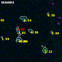 Object #4975 x,y = (7373, 2563) RA, Dec = (04:53:55.968, 02:54:25.92) = (73.48320, 2.90720) BPZ = 0.982 [0.756--1.635] type = 9.40 (SB2_B10 - SB3_B10) chisq2 = 0.02 ODDS = 0.36 z_cluster = 0.203