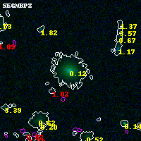 Object #5344 x,y = (2704, 2655) RA, Dec = (04:54:14.664, 02:54:31.32) = (73.56110, 2.90870) BPZ = 0.122 [0.080--0.377] type = 5.20 (ES0_B10 - Sbc_B10) chisq2 = 0.00 ODDS = 0.54 z_cluster = 0.203