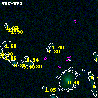 Object #5461 x,y = (7094, 2747) RA, Dec = (04:53:57.096, 02:54:37.08) = (73.48790, 2.91030) BPZ = 1.302 [0.161--2.611] type = 8.70 (SB2_B10 - SB1_B10) chisq2 = 0.03 ODDS = 0.12 z_cluster = 0.203