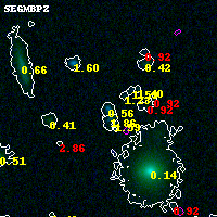 Object #6571 x,y = (2687, 3180) RA, Dec = (04:54:14.736, 02:55:03.00) = (73.56140, 2.91750) BPZ = 0.559 [0.471--2.398] type = 10.80 (SB11_A_0_l - SB3_B10) chisq2 = 0.00 ODDS = 0.14 z_cluster = 0.203