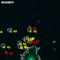 Object #6688 x,y = (2721, 3222) RA, Dec = (04:54:14.592, 02:55:05.52) = (73.56080, 2.91820) BPZ = 0.421 [0.087--3.018] type = 9.50 (SB3_B10 - SB2_B10) chisq2 = 0.04 ODDS = 0.11 z_cluster = 0.203