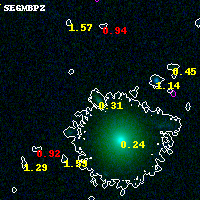 Object #7360 x,y = (1996, 7571) RA, Dec = (04:54:17.496, 02:59:26.52) = (73.57290, 2.99070) BPZ = 0.307 [0.038--3.249] type = 7.40 (Scd_B10 - SB1_B10) chisq2 = 0.00 ODDS = 0.36 z_cluster = 0.203
