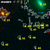 Object #8004 x,y = (2741, 4236) RA, Dec = (04:54:14.520, 02:56:06.36) = (73.56050, 2.93510) BPZ = 0.660 [0.171--2.687] type = 8.70 (SB2_B10 - SB1_B10) chisq2 = 0.02 ODDS = 0.12 z_cluster = 0.203
