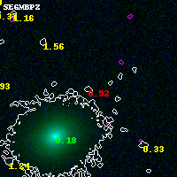 Object #8098 x,y = (4472, 4199) RA, Dec = (04:54:07.584, 02:56:04.20) = (73.53160, 2.93450) BPZ = 0.917 [0.567--10.363] type = 9.00 (SB2_B10) chisq2 = 4.29 ODDS = 0.18 z_cluster = 0.203