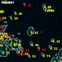 Object #8439 x,y = (6491, 4061) RA, Dec = (04:53:59.496, 02:55:55.92) = (73.49790, 2.93220) BPZ = 0.919 [0.874--2.150] type = 6.50 (Scd_B10 - Sbc_B10) chisq2 = 0.01 ODDS = 0.27 z_cluster = 0.203