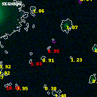Object #8834 x,y = (6051, 3850) RA, Dec = (04:54:01.272, 02:55:42.96) = (73.50530, 2.92860) BPZ = 0.949 [0.664--10.406] type = 2.00 (Ell6_A_0) chisq2 = 2.73 ODDS = 0.06 z_cluster = 0.203